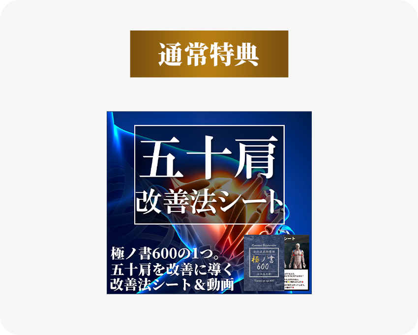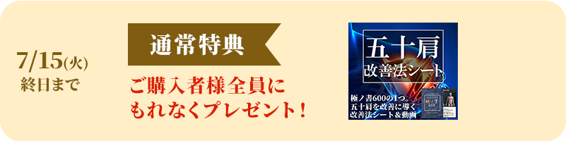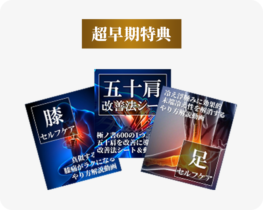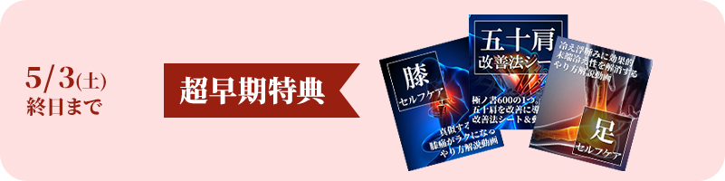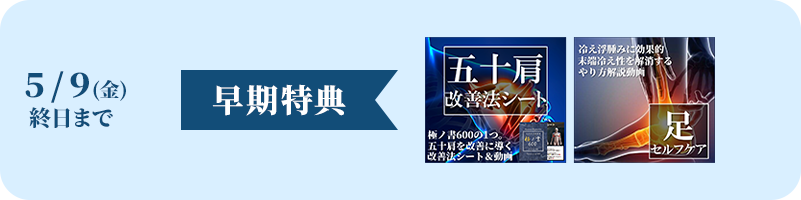 ※五十肩改善法シートは、シークレット体験説明会当日に紙媒体でお渡しいたします。足セルフケアは、早期特典受付期間終了後、約1週間以内を目途に解説動画をメールにてお渡しいたします。