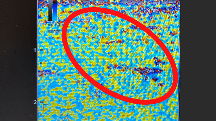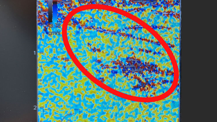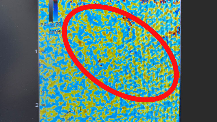壊れた組織を示す濃い赤や青が…