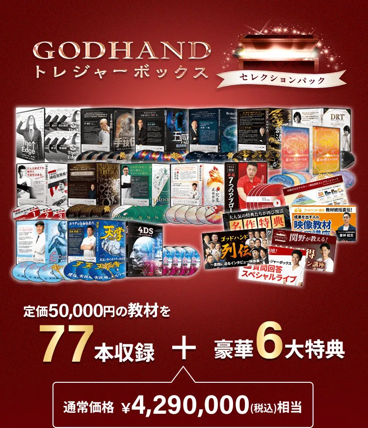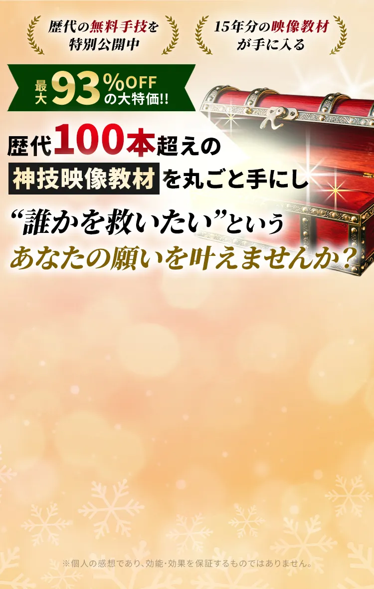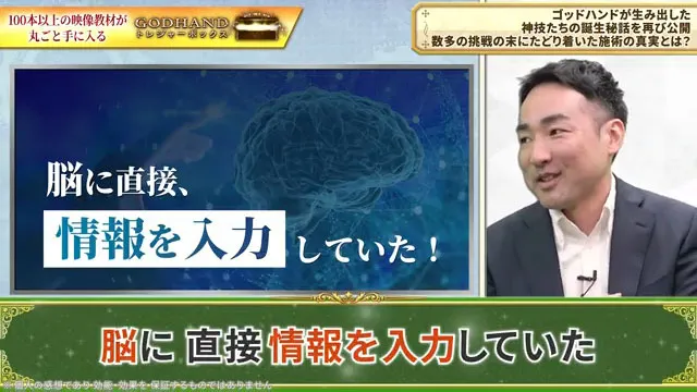 「自分に合った手技はどこにあるんだ…」という迷いがあっても、数多の神技を見比べながら学べるから、自分の中で“本当に納得できる答え”が見つかる。終わりのない探求と投資に終止符を打てる。