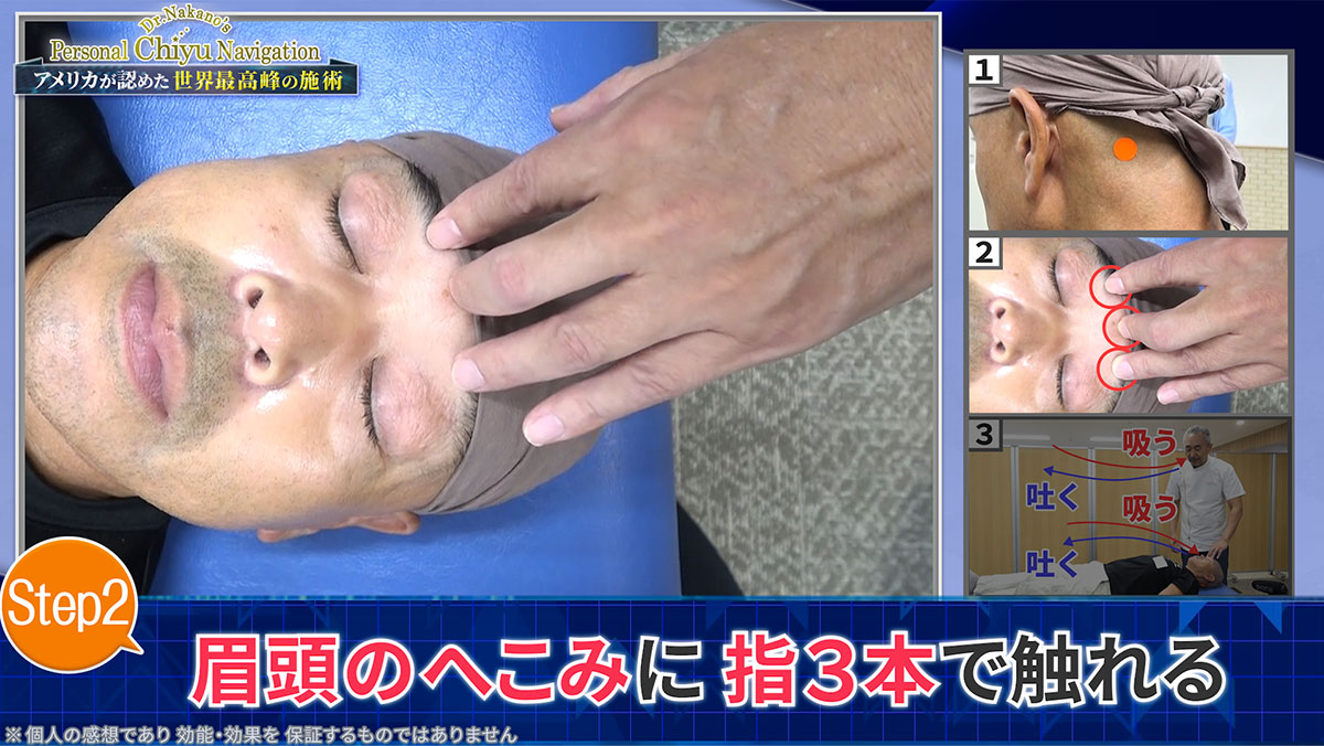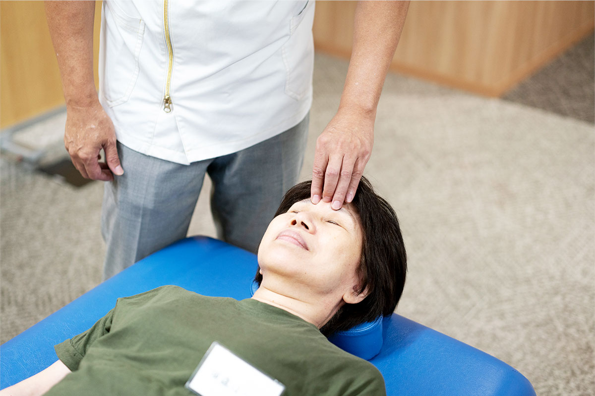 おでこに触れて呼吸を合わせるだけで首の痛みや可動域が一瞬で変化する。